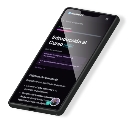 En Ironhack desarrollamos nuestra propia plataforma de aprendizaje. Contenido interactivo, proyectos prácticos y herramientas reales del sector, todo en un mismo lugar para que aprendas haciendo desde el primer día.
